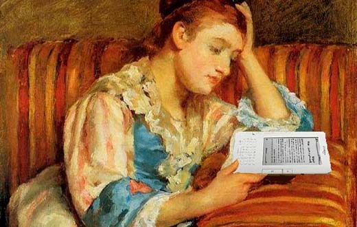 Mrs. Duffee Seated on a Striped Sofa, Reading Her Kindle, After Mary Cassatt, détournement par Mike Licht, NotionsCapital.com via FLickr [ccbyncsa]